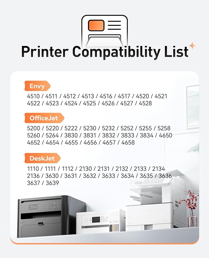 - Compatible with HP Envy series: 4510, 4511, 4512, 4513, 4516, 4517, 4520, 4521, 4522, 4523, 4524, 4525, 4526, 4527, 4528 printers. Compatible with HP OfficeJet series: 5200, 5220, 5222, 5230, 5232, 5252, 5255, 5258, 5260, 5264, 3830, 3831, 3832, 3833, 3834, 4650, 4652, 4654, 4655, 4656, 4657, 4658 printers. Compatible with HP DeskJet series: 1110, 1111, 1112, 2130, 2131, 2132, 2133, 2134, 2136, 3630, 3631, 3632, 3633, 3634, 3635, 3636, 3637, 3639 printers.