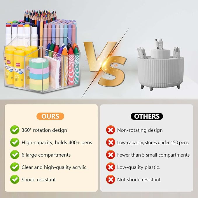 - 【360° Degree Spinning Design】Our acrylic pen holder features a 360° rotating base that lets you quickly spin to each compartment, allowing easy access to your pens and stationery items. The smooth spinning enables you to effortlessly turn to each compartment and organize your items by type, keeping everything organized and saving you time.