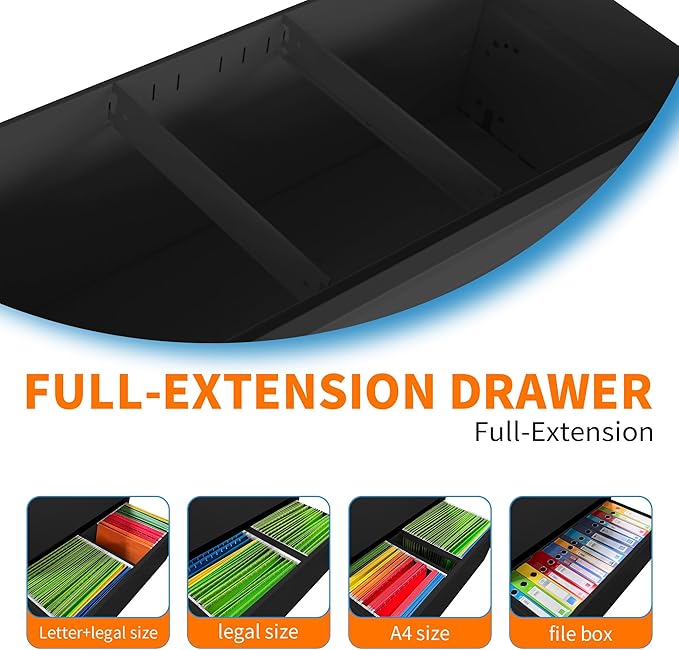 - 【Unique Design】 The steel file cabinet features precision ball bearing full suspension slides, ensuring silent and smooth opening and closing of the drawers. With a full extension drawer design and humanized handles, this locking cabinet offers convenient and effortless functionality.