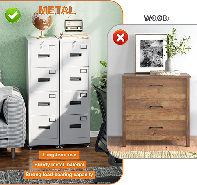 - 【Stylish and Practical】Featuring simple stylish appearance, this 4 drawer metal files cabinet with lock fits under most desks, keep your workspace tidy and clean
