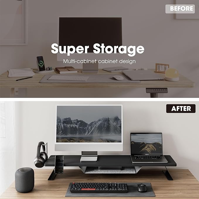 - 【Ergonomic & Adjustable】Monitor shelf raises your monitor or laptop by 5.4 inches to the perfect eye level, reducing neck and shoulder strain. Pre-drilled holes computer stand let you position headphone stand and phone holder left or right according to your habits, balancing efficiency and health.