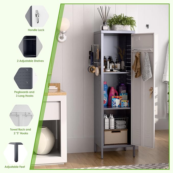 - 【Multifunctional-use】Metal storage locker door has a towel rack with two S-hooks for hanging towels.The Pegboards on both sides of the locker have three long hooks that can be used to hang clothes