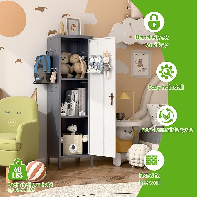 - 【Safe Use】Locker doors are equipped with hand locks to avoid children from opening them and the doors are equipped with vents to keep the air fresh. The locker can be mounted on the wall to avoid collapse
