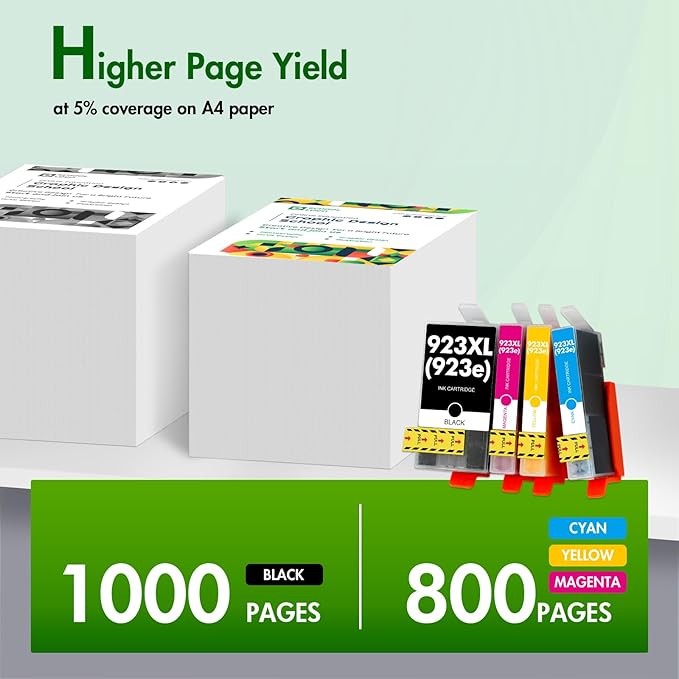 - High Page Yield: It yields up to 1,000 pages for each 923XL Black Ink and 800 pages for each 923XL Color Ink at 5% coverage (A4e letter)