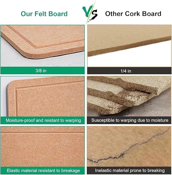 - Lightweight & Durable: The felt board is made of recycled polyester, they are safe and odorless, they are also very light but dense and sturdy. With a thickness of up to 0.35 inches can hold your pins firmly in place without falling off.
