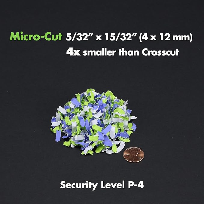 - Shreds paper, CDs, DVDs, credit cards and junk mail into small pieces (5/32 by 15/32 inches), security level P-4