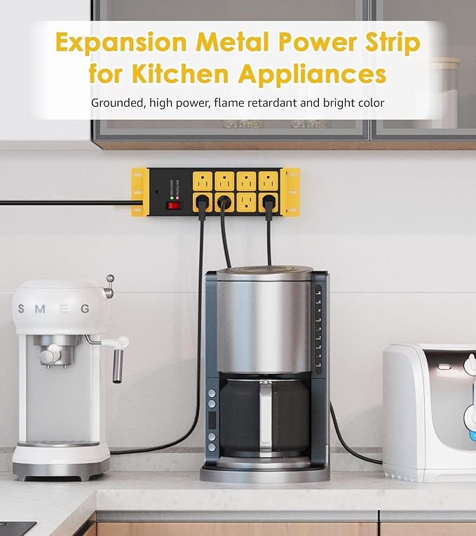 - Durable Housing - 8 outlet power strip surge protector - Thickened aluminum alloy shell and quality power modules, provides on/off switch with indicator light, fire retardant. suitable for small kitchen appliances as well as high power industrial equipment, more secure. And designed with bright yellow element can make you can find it immediately!