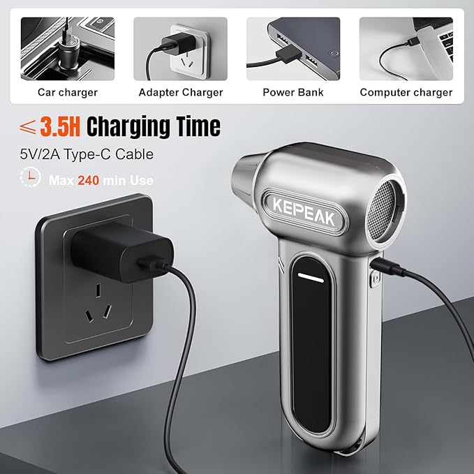 - Cordless & Rechargeable Air Duster: Enjoy the freedom of cordless operation with a built-in 4000mAh rechargeable battery and USB Type-C fast charging. The air duster rechargeable design ensures up to 110 minutes of continuous use on low speed and quick recharging in just 3.5 hours.