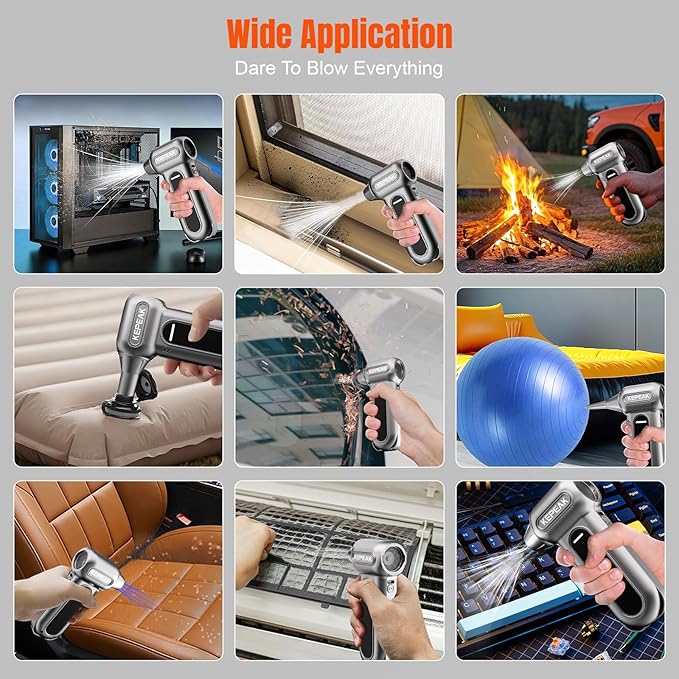- KEPEAK Compressed Air Duster with Brushless Motor: Experience high-speed cleaning with our electric air duster, featuring a brushless motor that delivers up to 130000 RPM and 200W max power for efficient dust removal on electronics, keyboards, and PC components.
