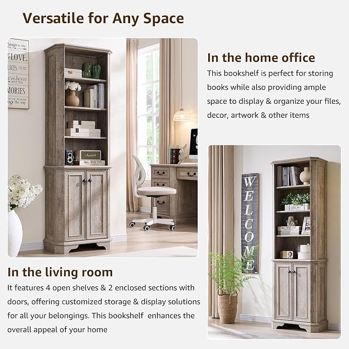 - Elegant & Sturdy 6-Tier Farmhouse Bookshelf with Farmhouse Charm: Upgrade your home office or living space with this 6-tier wood bookshelf, measuring 23.5”W x 11.7”D x 72”H. Designed to double as both a bookcase and a storage cabinet, it blends Victorian-style elegance with modern durability. The framed door fronts, hand-polished vintage mushroom knob, and a natural wood grain finish create a refined yet rustic aesthetic, enhancing any office or home décor