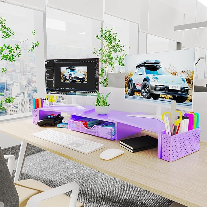 Spacrea Metal Desk Organizers and Accessories, Dual Monitor Stand Riser with Drawer and 2 Pen Holders, Desk Accessories & Workspace Desktop Organizers for Office Supplies (Purple)