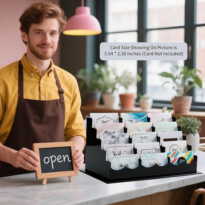 - STURDY CARD STAND - This acrylic desktop business card holder is built to last. Measuring 12.8 inches in length, 6.8 inches in width, and 6.4 inches in height,5 tiers 15 pockets, it can sit securely on any counter or desktop. This make it perfect for a variety of settings, including small businesses, individual departments, reception desks, and trade shows.