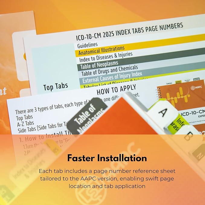 - Comprehensive Set: This complete set covers all the key sections of the AAPC ICD-10-CM 2025 book, featuring Top Tabs for main sections, Side Tabs for detailed diseases & code ranges, and A-Z Tabs for quick access to the Index. The scientific tab design ensures efficient and accurate referencing.