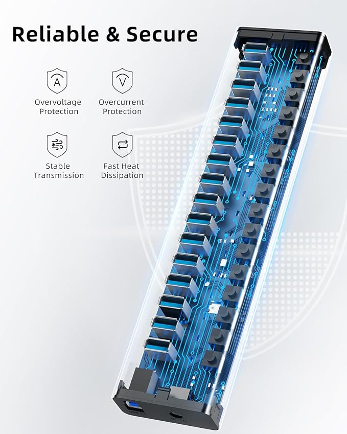- 【96W Powered Hub with Surge Protection】Delivers 96W power via a 12V/8A adapter for stable multi-device charging, built-in surge protection safeguards against voltage spikes, avoiding costly device damage during electrical storms.