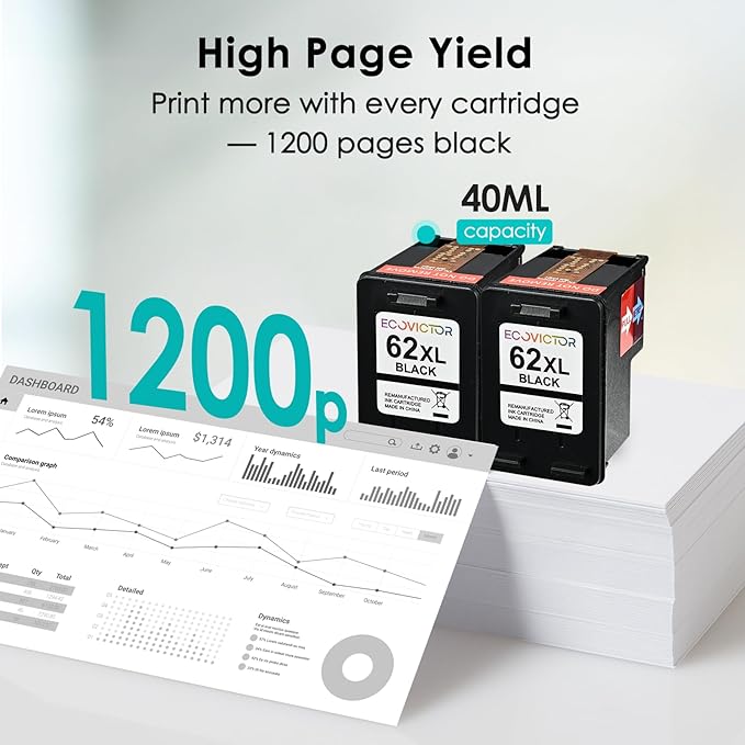 - Vivid, Professional Results: Formulated with premium-quality ink, our black printer ink 62xl replacement for hp ink 62xl black delivers crisp, clear text and rich, vibrant images. EcoVictor printer ink 62xl for hp ink 62 black is perfect for everyday documents, schoolwork, creative projects, and photosβfade-resistant and smudge-proof.