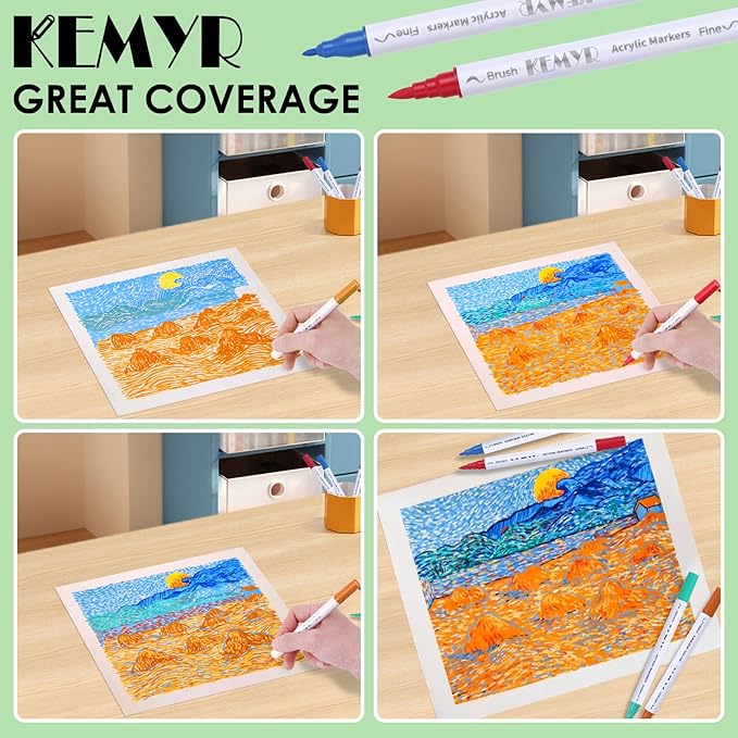 - Dual Tip Acrylic Paint Pens----Each KEMYR pen is equipped with a 1 mm fine tip for lines and details work, and a 1 - 5 mm brush tip for filling large areas and coloring. By changing the brush pressure, you can create different strokes, saving the trouble of changing tips.