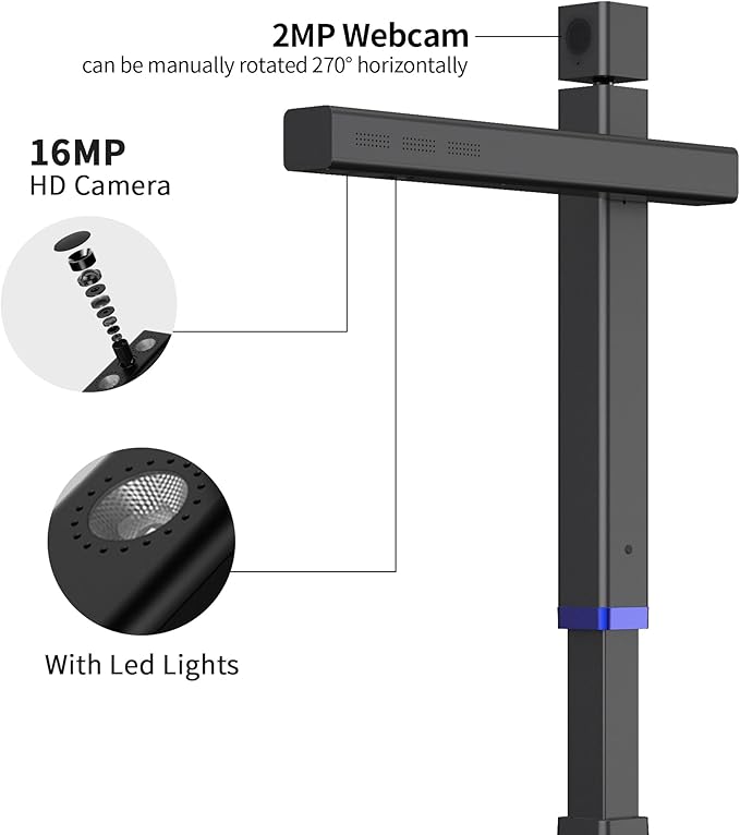 - Top Rotatable Webcam: There is a 2MP webcam on the top of the scanner that can be manually rotated 270Β°, it can help you capture your face while using a visual presenter or recording a video (you need to download the software "CZUR Camera" instead of "CZUR Scanner")