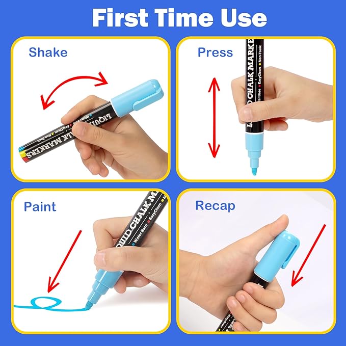 - ​​Non-Toxic & Kid-Safe Formula​​ - Certified ASTM D-4236 & EN-71 compliant, our chalk markers for blackboard are odorless, alcohol-free ink washes off skin with water. The wear-resistant fiber tip withstands 5,000+ presses without losing resilience. Safe for ages 3+, these markers eliminate chalk-dust allergies—perfect for crafts, family memo boards, and worry-free creativity.
