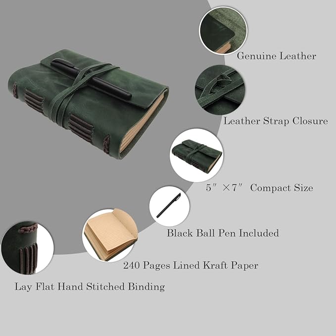 - MULTIPURPOSE LEATHER JOURNAL NOTEBOOK – green books for men and women ,This versatile men’s and women’s journal can be used as an appointment book, daily journal, sketchbook, or travel diary