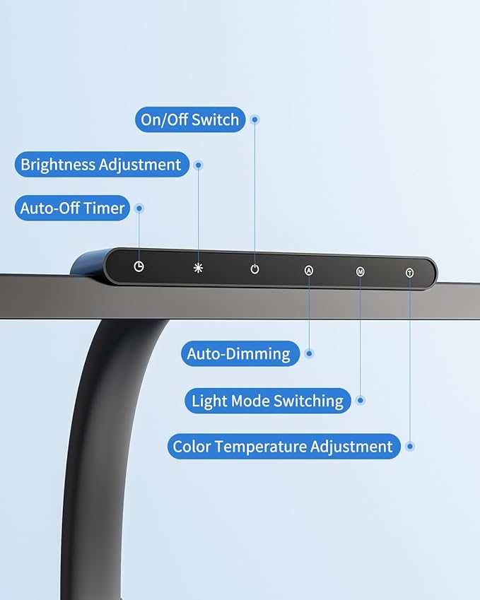 - Simple & Sensitive Control: Elevate your workspace with this smart touch desk lamp featuring auto-dimming technology that adapts to ambient light. Effortlessly adjust color temperature (3000K-6000K) and brightness (10%-100%) via the touch panel. The built-in memory function saves your preferences, while its sleek design makes it the perfect table lamp for desk setups