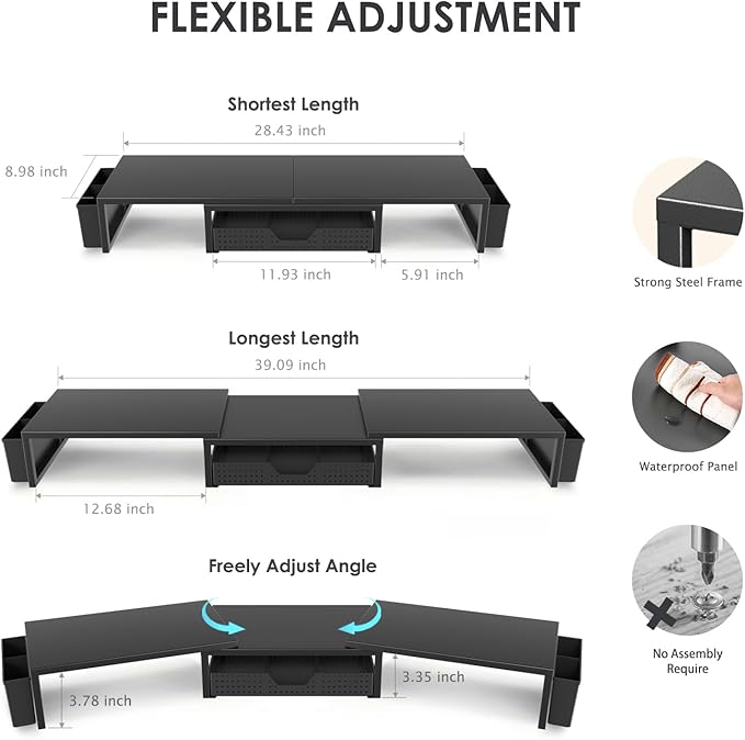 - 【 Dual Monitor Stand with Smart Storage】Clear workspace clutter effortlessly. Organize desk accessories & office supplies in handy 2 hanging pen holders and a drawer. Keep essentials visible and instantly accessible for better focus and efficiency