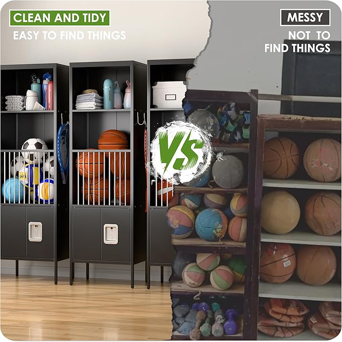 - Convenient Design: Spacious open compartments can storage access to water cups, towels and other items. High feet of lcoker to avoid moisture or put your shoes under your locker, can storage your sports balls inside the railings to avoid losing them and store essentials in the space inside the lockable door