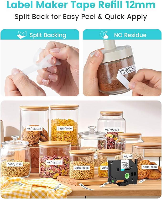 - 【5-Pack Label Maker Tape Refill Package Includes】Replacement for Brother label maker tape TZe-231 TZ231, TZ231s, TZ-231, TZE231, AZe-231, 1/2”(0.47”) wide x 26.2 ft. (8m) long / Pack, 40m long in toal. Replacement for brother 12mm .47 laminated white tz tape labeling, organizing, and keeping track of your essentials a breeze
