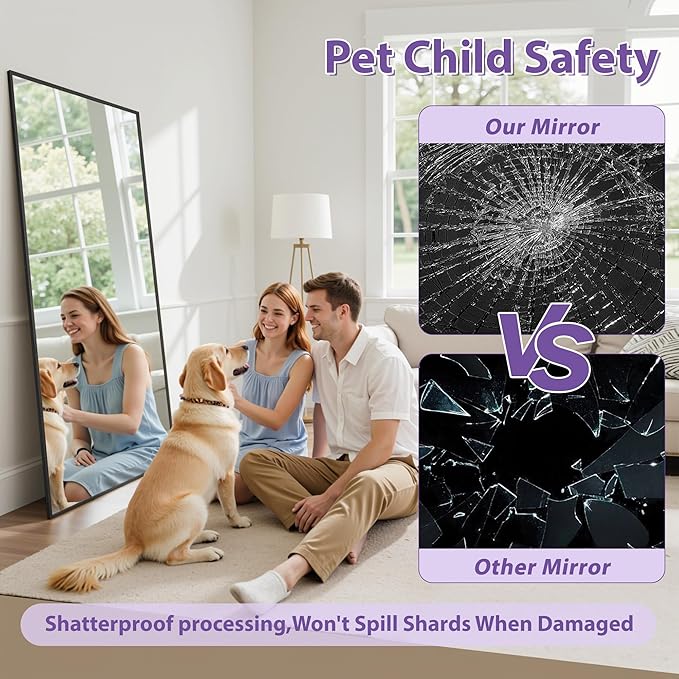 - High Quality and Safety Guarantee: The floor mirror is made of 3mm HD nano glass which provides high definition reflection. The back features an anti-explosion film, even if it's accidentally damaged, shards won't scatter everywhere, safe for surrounding children or pets