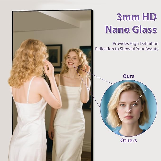 - High Quality and Safety Guarantee: The floor mirror is made of 3mm HD nano glass which provides high definition reflection. The back features an anti-explosion film, even if it's accidentally damaged, shards won't scatter everywhere, safe for surrounding children or pets