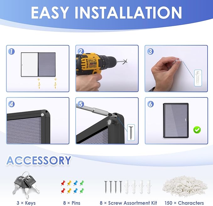 - π§ Easy To Install βThe changeable letter board includes top and bottom metal brackets and mounting hardware. The sign board can be installed on most wall types with included instructions