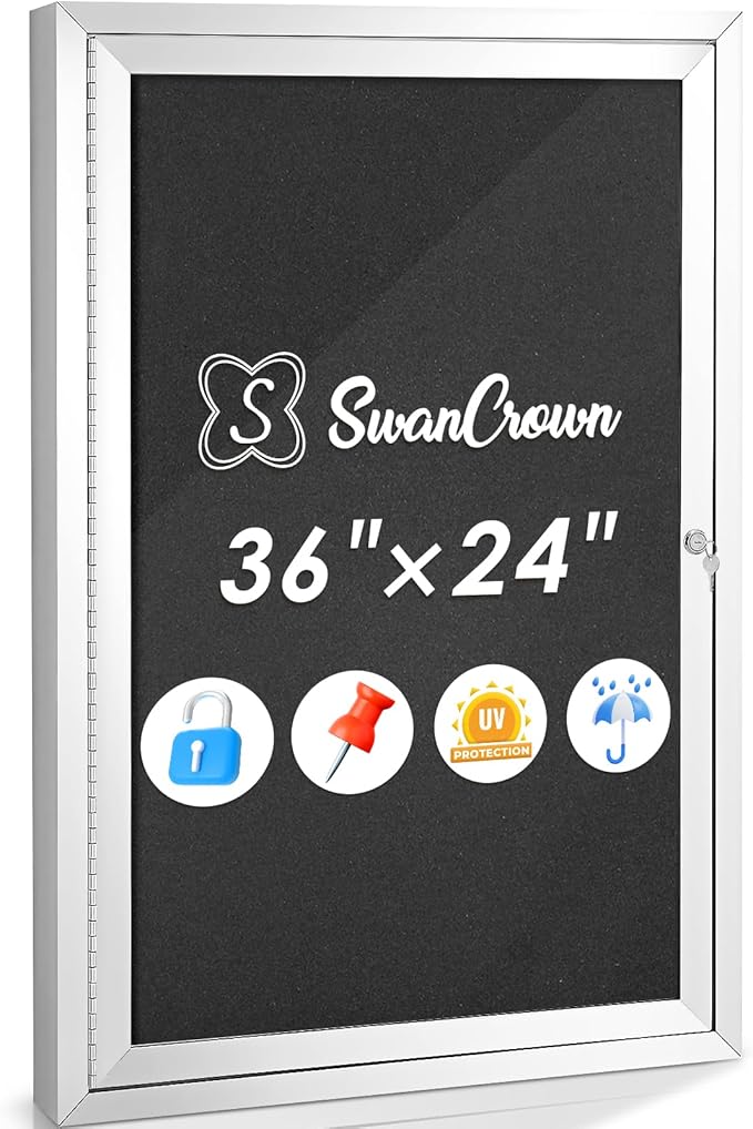 SWANCROWN Outdoor Bulletin Board Weatherproof 36x24in, Enclosed Bulletin Board with Locking Door Wall Display Case for Office School Commerce Show, Black Felt, Sliver Aluminum Frame