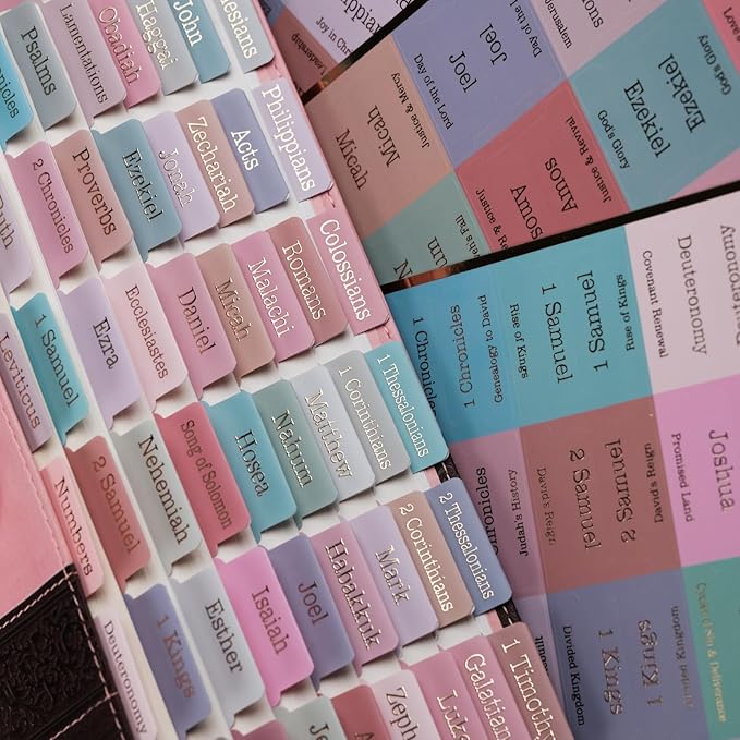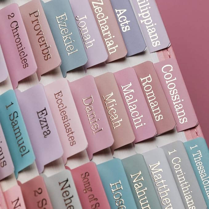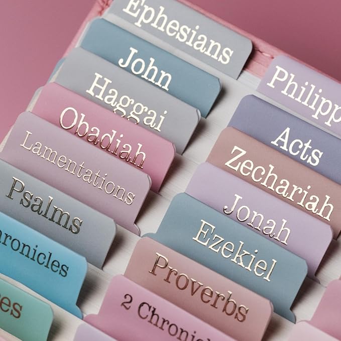 - Large Print, Easy to Read & Easy to Install:Silky velvet touch laminate,carefully designed pretty Bible accessories . The peel-and-stick Bible index tabs are self adhesive, simply align them with the provided guide or place them creatively.