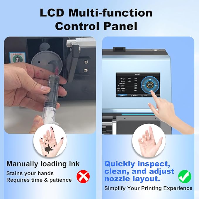 - 📺LCD Multi-Function Control Panel + High-Performance Motherboard – Integrated controls quick nozzle checks, cleaning, and layout adjustments. Lets you operate the printer without opening any software, saving time and effort 【One-Click Ink Fill 】 No need to manually extract ink resulting in stains and messes
