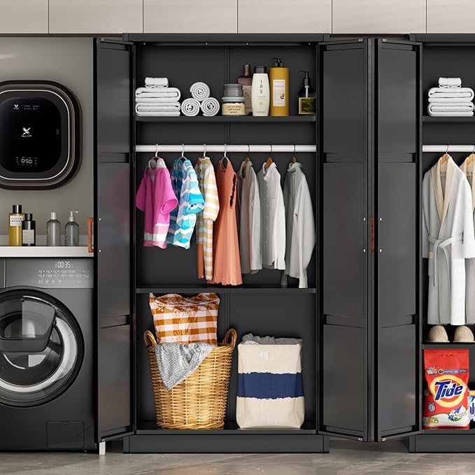 - Safe & Stable Wardrobe: Greenvelly Metal Armoire Cabinet Doors are equipped with 2 powerful magnetic closures to ensure that the doors close tightly and keep your belongings safe from dust. In addition, its well-designed anti-tipping system enables the steel wardrobe to be securely fixed to the wall, effectively preventing the possibility of accidental tipping.Metal storage cabinet can be used with confidence, especially for families with children.