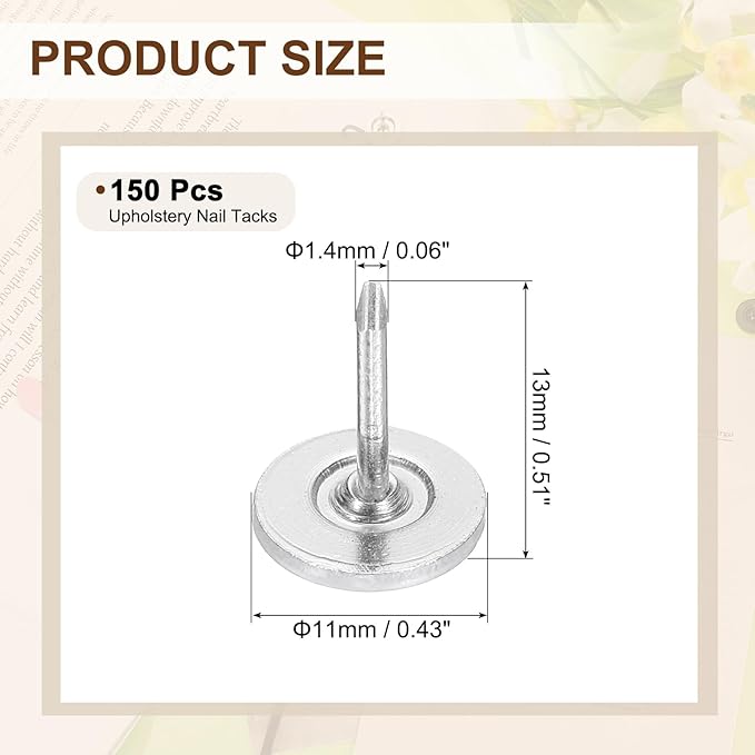 - [Size & Quantity] - The package comes with 150pcs decorative upholstery tacks. Sufficient quantity to meet your different daily needs. The overall size of upholstery nails is about 11mm x 13mm/0.43-inch x 0.51-inch(D*H)