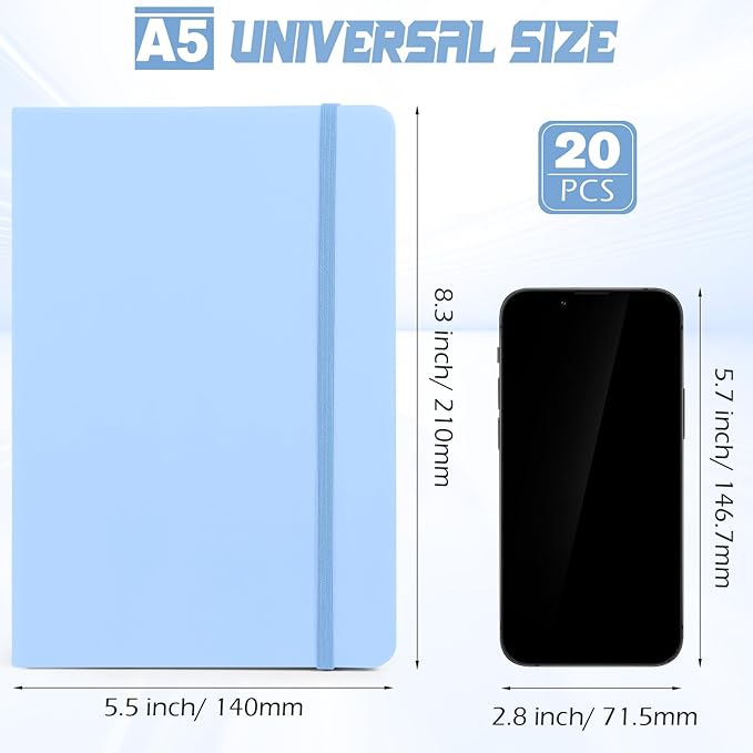 Honoson 20 Pack Lined Journal Notebooks A5 Hardcover Executive Notebook 5.5" x 8.3" PU Leather Wide Ruled Journals Bulk with Elastic Band for Home Business Office School Supplies(Light Blue)