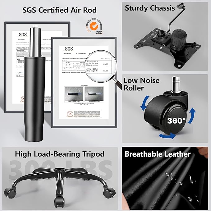 - Sturdy & Durable:Heavy-duty metal base supports up to 300 lbs. Reinforced with SGS-certified Grade 3 gas lift and 360Β° silent swivel casters for stability and smooth mobility. Explosion-proof base ensures long-lasting reliability.