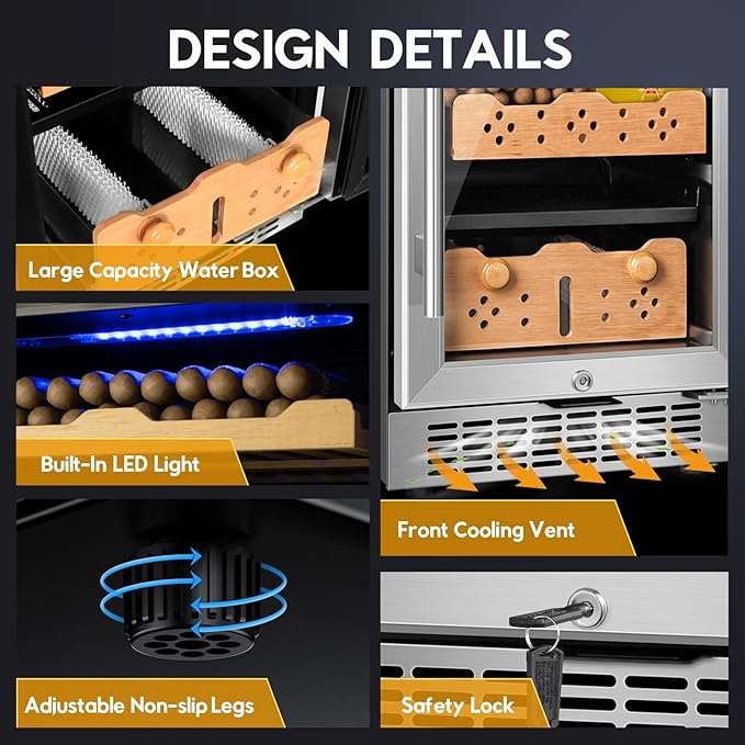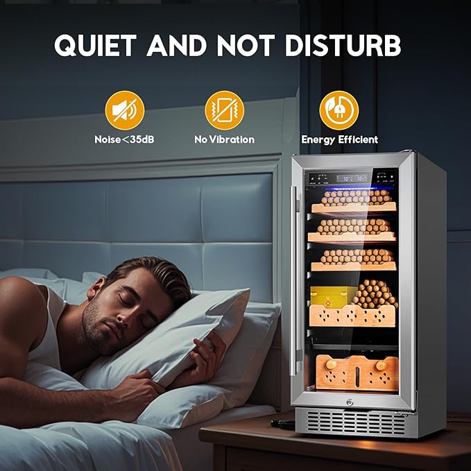 - 【Silent Compressor Cooling& 546 Cigar Capacity】Using silent compressor refrigeration technology, compared with semiconductor refrigeration, the compressor service life is increased by 30%, refrigeration speed is increased by 40%, temperature and humidity fluctuation ≤1, noise ≤ 35dB, no vibration, so you can enjoy life without worry. Front air outlet and 4 adjustable non-slip feet, which can be built-in or under-counter. The electric humidors for cigars have a capacity of up to 88L and can hold up to 546 cigars (depending on ring gauge). It is equipped with a safety lock to ensure the security of your precious collection.