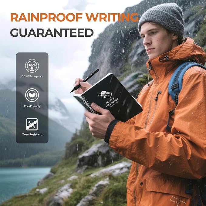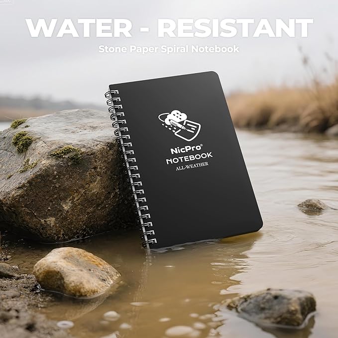 - 100-Page All-Weather Waterproof Notebook: Built to withstand rain, humidity, dirt, and rough handling. The 4.8"x7" pocket-friendly notebook features 170gsm stone paper (50 sheets/100 pages) inside a rugged PVC cover that repels water, resists tearing, and keeps your notes safe anywhere—ideal for travel, fieldwork, and job sites.