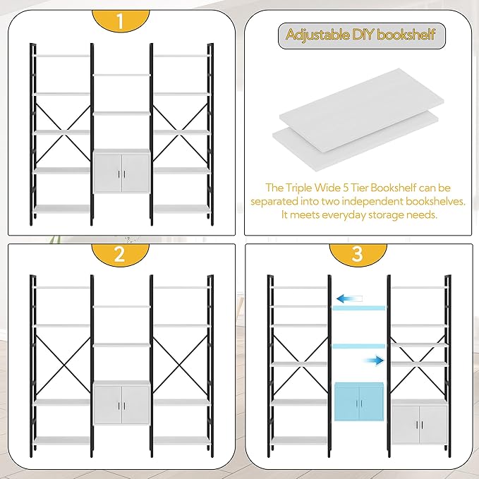 Yusong Bookshelf Triple Wide 5 Tier Bookcases with Storage Cabinet, Industrial Large Modern Tall Bookshelves with 12 Open Display Shelves for Living Room Office Bedroom, White and Black