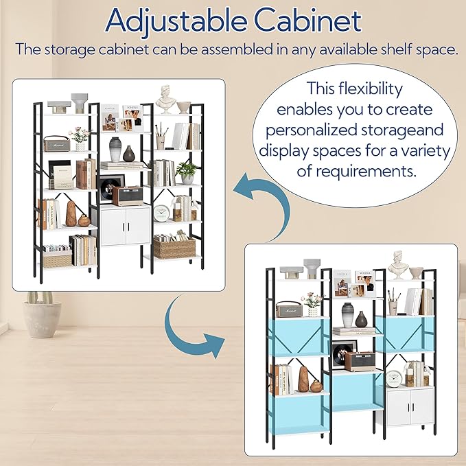 - 【Adjustable Shelves & Storage Cabinet】Unlike fixed shelves, this bookcase features adjustable shelves, allowing you to customize the height and placement of each shelf according to your specific needs. Additionally, The storage cabinet can be assembled in any available shelf space. This flexibility enables you to create personalized storage and display spaces for a variety of requirements.