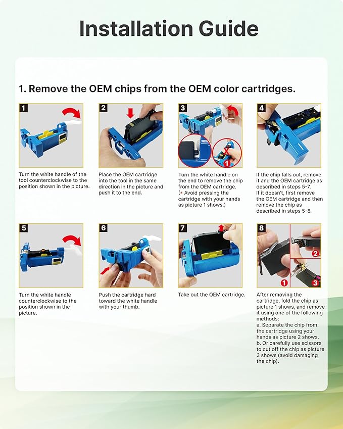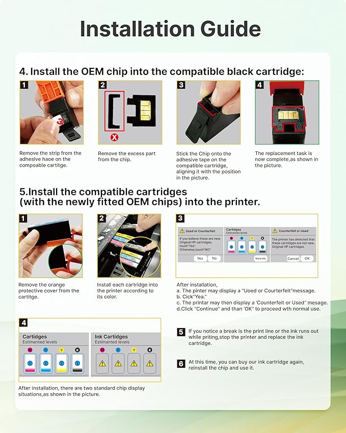 - 𝐍𝐨𝐭𝐢𝐜𝐞!𝐍𝐨 𝐂𝐡𝐢𝐩: Please check if you have the OEM 923 ink cartridges for hp printers before order and follow the Installation Guide to swtich the oem chip on Our 923 for HP ink cartridge to help it work well on your printer.