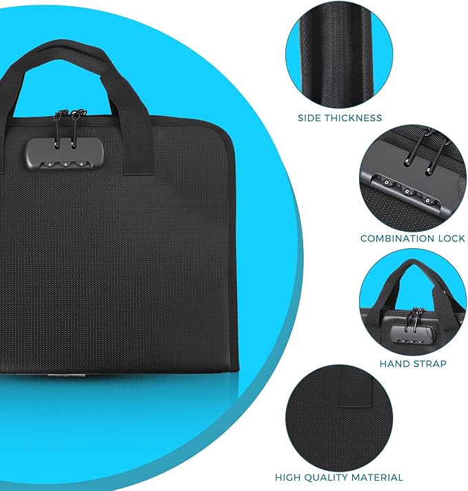 - High-Quality Materials:Fireproof expanding file organizer made of 3-layered silicone-coated fiberglass, withstands extreme temperatures up to 2500β has passed SGS testing(UL94 certified). Protects important documents from fire, flood, and wet weather conditions
