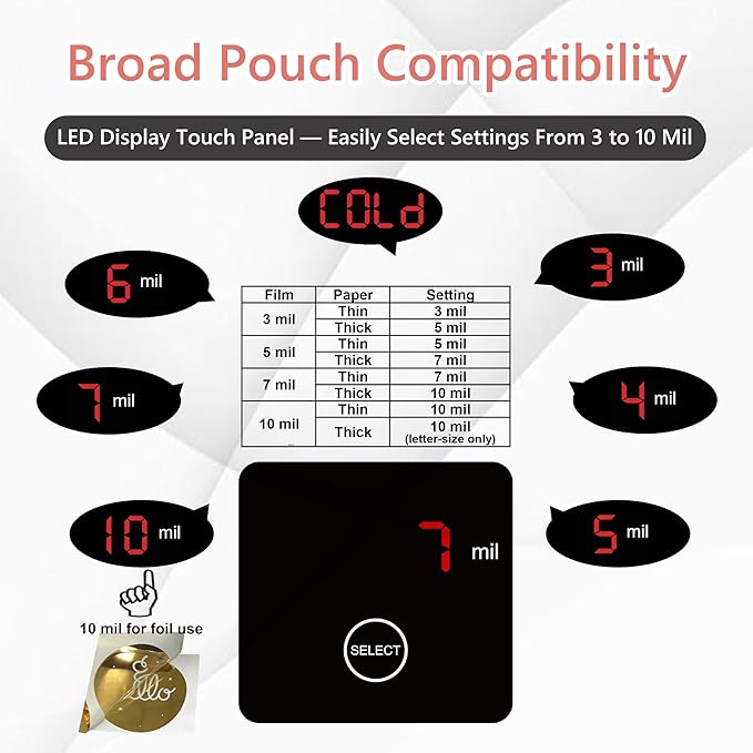 - 【LED Display Touch Panel】Easily select the appropriate setting based on pouch thickness with a simple, beginner-friendly one-touch control. Setting recommendations according to sheet and paper thickness are clearly printed on the machine for quick reference and ease of use.