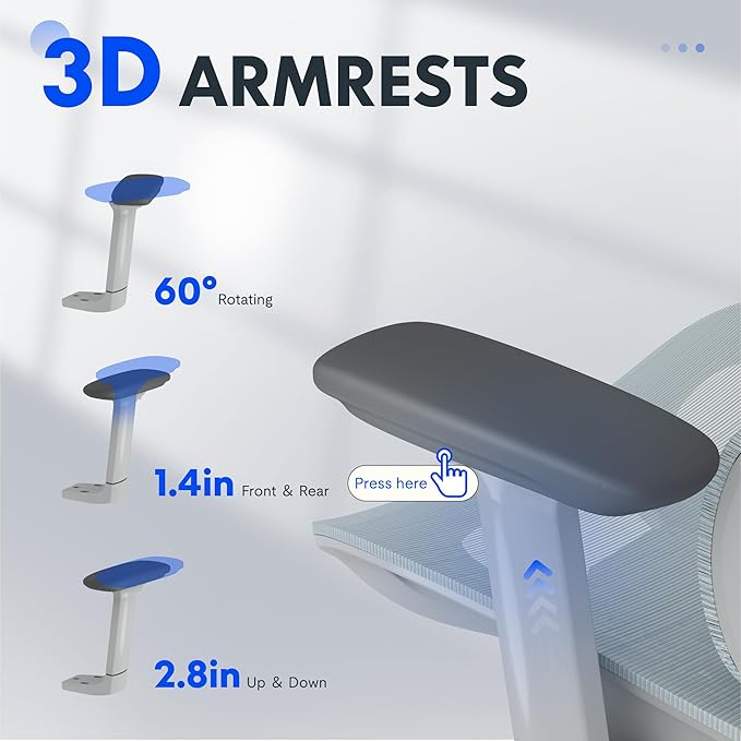 - 3D Armrests: Fully adjustable armrests (height, forward/back, and swivel) allow for precise positioning to reduce arm strain during extended use.