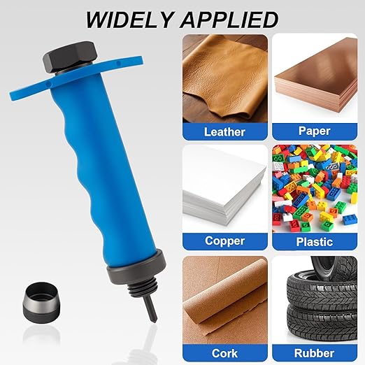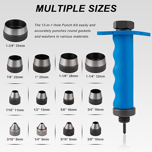 - Leather Hole Punch:With the 13-in-1 Hole Punch Kit, you can easily and accurately punch round gaskets and washers in various materials like leather, copper, plastic, rubber, paper, cork, and more. This kit eliminates the guesswork by creating clean and precise holes from 3/16-inch to 1-3/8-inch (5-35mm) in diameter, even in materials that are difficult to cut with scissors or knives