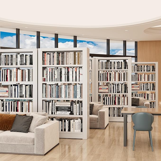 - Book Case Safety & Stability Features: Modern bookshelf includes anti-tip hardware that meets US safety standards. Rounded corners prevent injuries, steel shelves with bookends keep items secure. The 36" wide base provides exceptional stability for this tall storage unit.