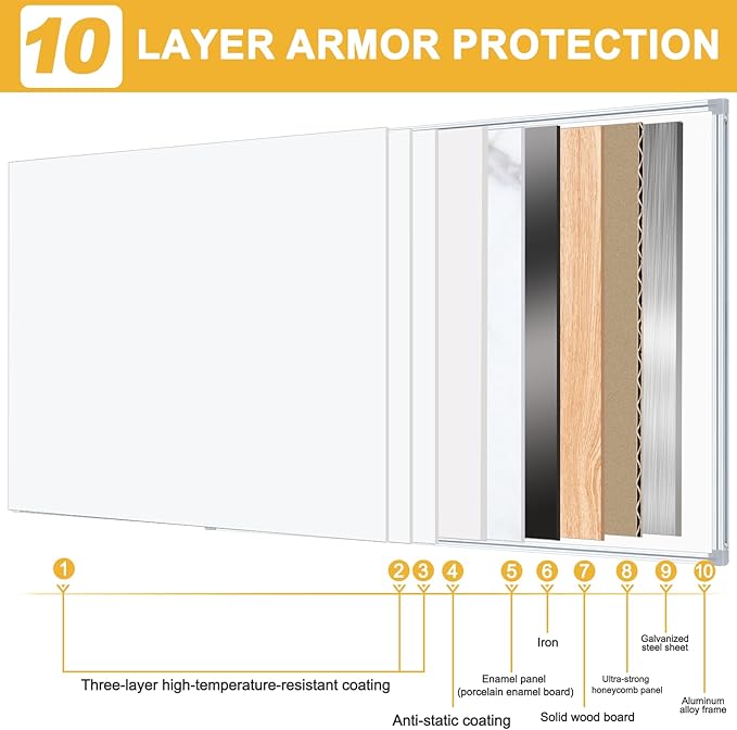 - ✔️ Luxury Belgian Enamel Surface - The 8’x4’ magnetic dry erase board made of imported high-gloss porcelain steel delivers ultra-smooth writing, effortless wiping, and ZERO ghosting even after years of heavy use. Also, This whiteboard is both waterproof and fireproof, and it’s very eco-friendly.
