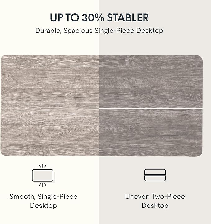 - AMPLE WHOLE-PIECE DESKTOP: With its whole-piece 1β eco-friendly desktop, this standing desk provides plenty of room for your computer setup, documents, and accessories, creating a well-organized and productive work environment. Due to hand measurements, desktop dimensions may vary slightly by 0 to 1β.
