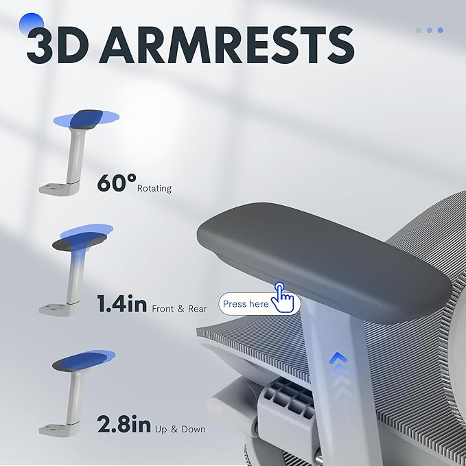 - 3D Armrests: Fully adjustable armrests (height, forward/back, and swivel) allow for precise positioning to reduce arm strain during extended use.